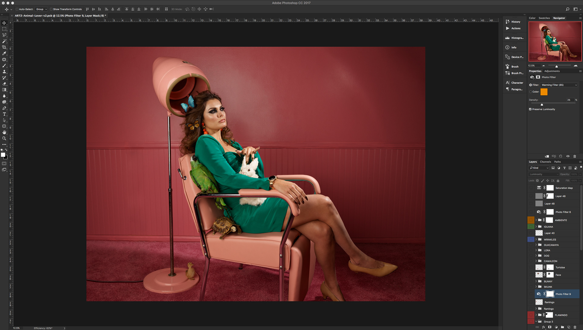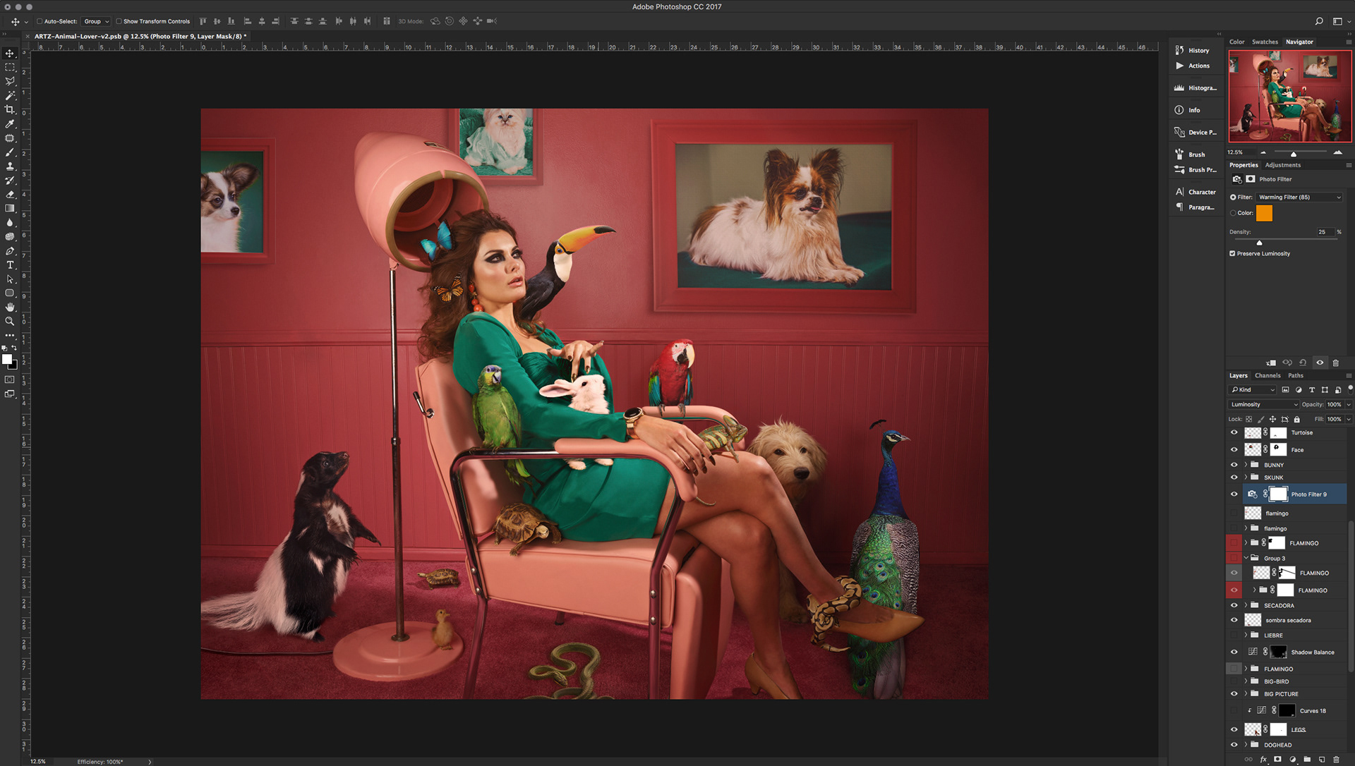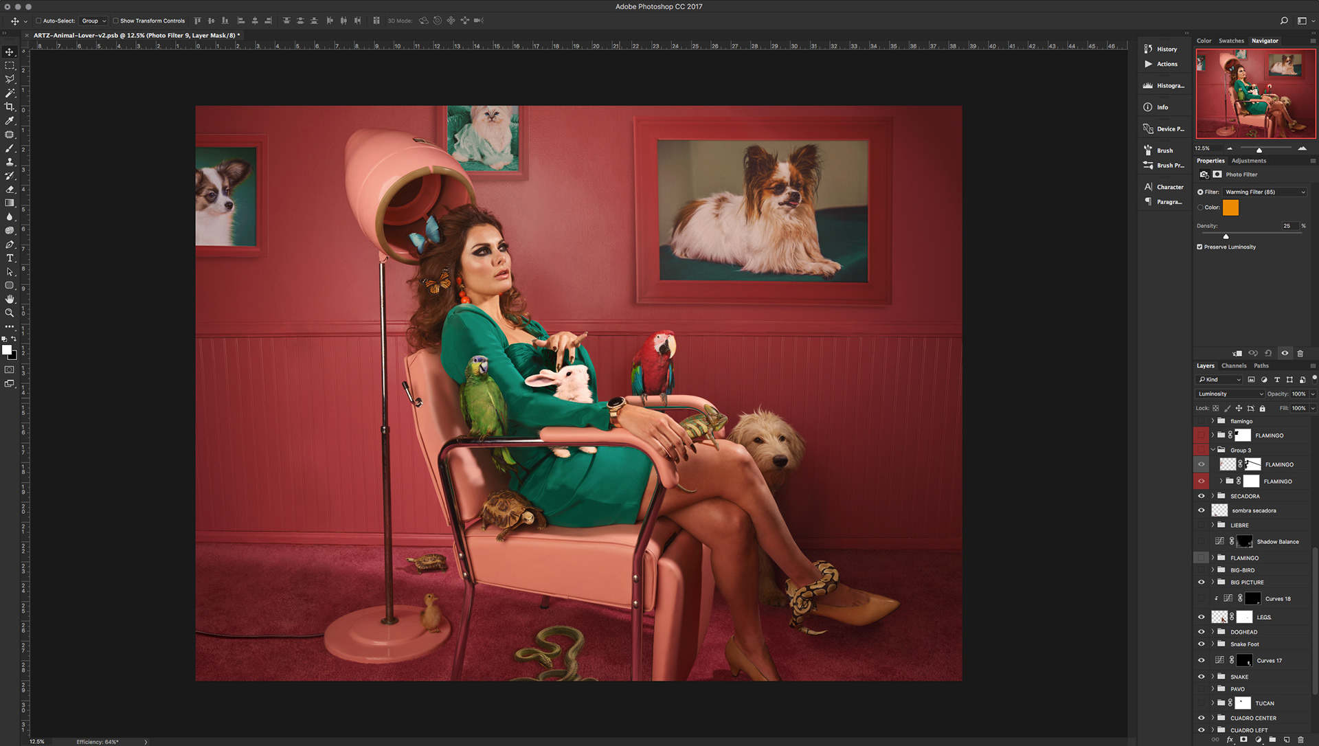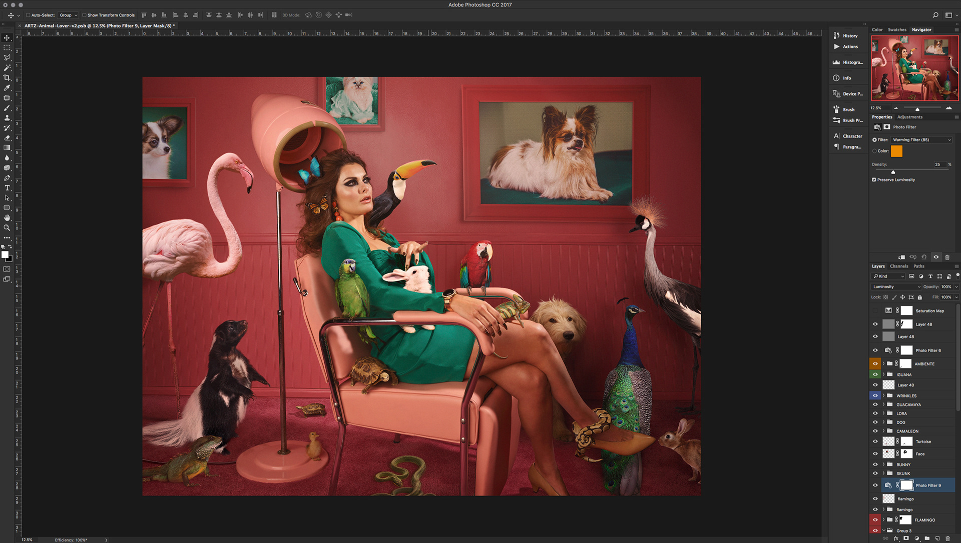 Since I took care of the background completely I did some light color correcting and grading to the general scene so the process of integration of all the animals is smoother. Lots of curves, dodge & burn, shadows & highlights work. Several light wraps for each animal. I used a saturation map to guide me through the entire composite.