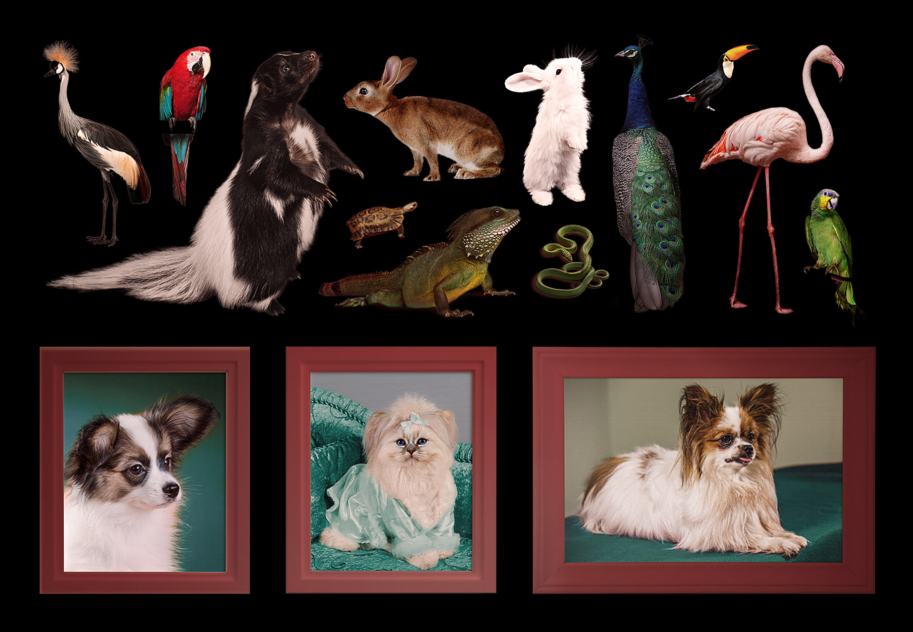 As you can see the source material for the composite was abundant. It started with many shots from a special photoshoot on a rather simple yet very well designed set with a model, a few props and some of the animals you see in the final image.