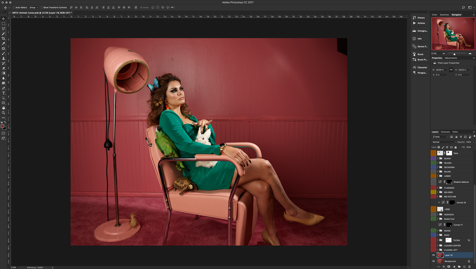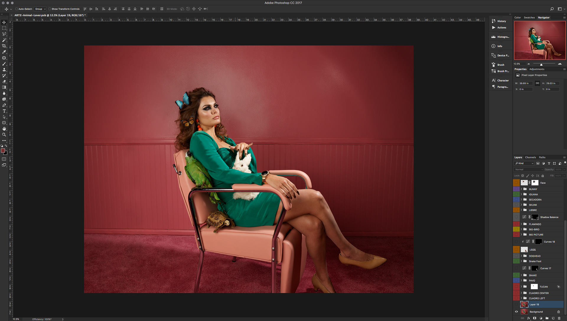 After the face of the model I replaced the white prop bunny for the stock photo one as well as the green parrot. Then I added the macaw, the chamaleon, both snakes, the dog and the little tortoise. Basically worked on all the animals closer to the girl first. The ones interacting with her directly.