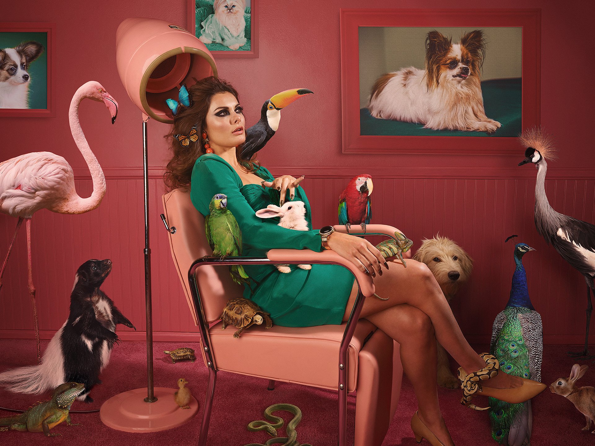 Some of the animals on set were alive and posed along side the model in a very fashionable manner. Others were props to be replaced later.