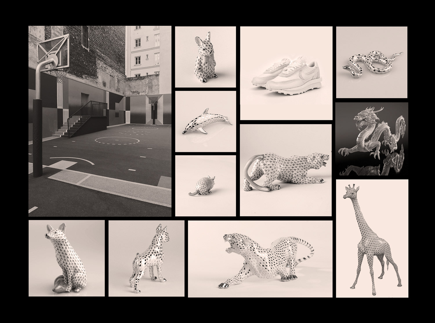 I integrated the shoe with no problem but the scene looked pretty empty. I was looking for a dragon to use in a different project and I came across these fancy porcelain figurines. I discovered that their pattern belongs to a very specific style from Austria called Herend (I think it is the brand name). They looked awesome so I tried integrating one of them into the scene and looked super cool so I filled the rest of the space with more of them.